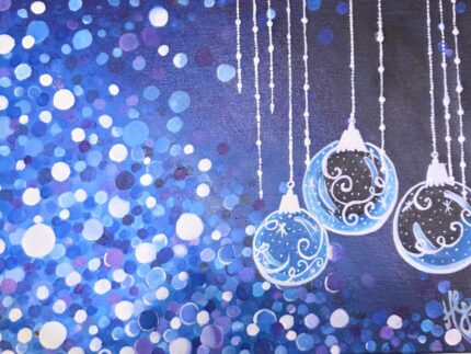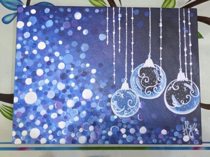The monochromatic blue palette combined with the "bokeh" effect (the blurry dots in the background) gives it a magical, wintry feel. The ornaments themselves are detailed with intricate white scrollwork and stars, offering a sharp, elegant contrast to the dreamy, soft-focus background. This painting perfectly embodies the stillness and sparkle of the holiday season. Painted on a 12x16" pre-primmed canvas, this is a monochromatic style painting, and secured with medium varnish protection. No prints available.