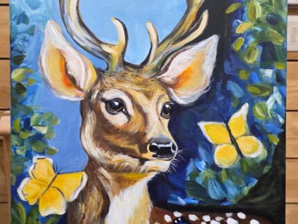 This piece captures a moment of quiet magic where the boundary between the forest and the dreamworld thins. This is a vibrant, whimsical acrylic or oil painting of a young buck set against a dreamlike forest backdrop. Painted on a 16x24" white gesso pre-primed canvas. Medium gloss varnished. No Prints available.
