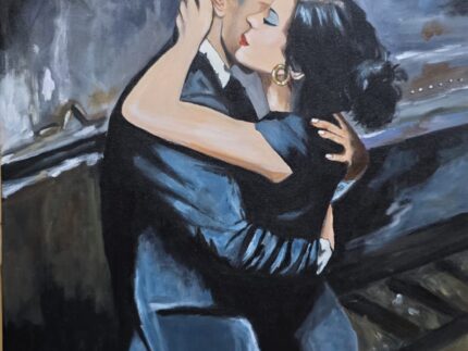 In a world dissolved into shadows and smoke, two souls find their center. She leans into him with a delicate certainty, her hand tracing the nape of his neck like a familiar melody. Her closed eyes suggest a moment not just of sight, but of deep feeling—an escape into the quiet rhythm of a heartbeat. The cool light catches the folds of his suit and the silk of her hair, painting a portrait of a love that doesn't need to shout to be heard. Painted on a 18x24" inch pre-primed canvas. Secured with medium gloss varnish. No copy or digital prints available.