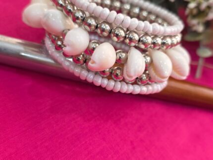 All of these silver bead shells and seashells are designed and matched with neutral White color schemes to create bracelets from them. These are White-tinted neutral bracelets with metal springs, best for any occasion to go with. Complete handmade natural beads and  Seashell bracelets.