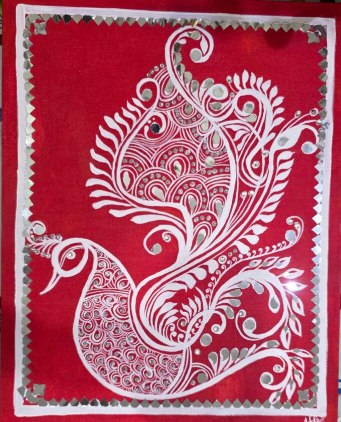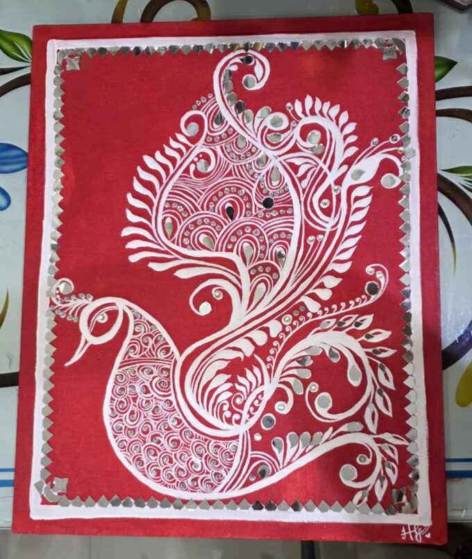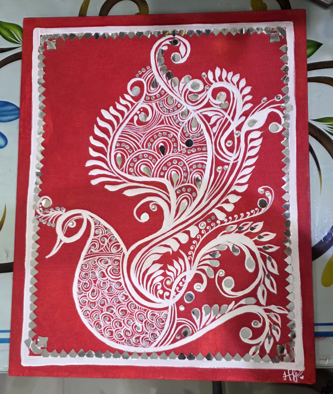 This is a canvas board (size 16×20 inches) with framing already done. The Alpona design work on board with Titanium White (acrylic) with Kolka design for peacock. I tried a new style to create a decorative piece on a canvas board, and I ornamented it with Kundan Stones and Mirror work. It enhances the beauty and uniqueness of this art piece. This Canvas board is secured with a border frame.