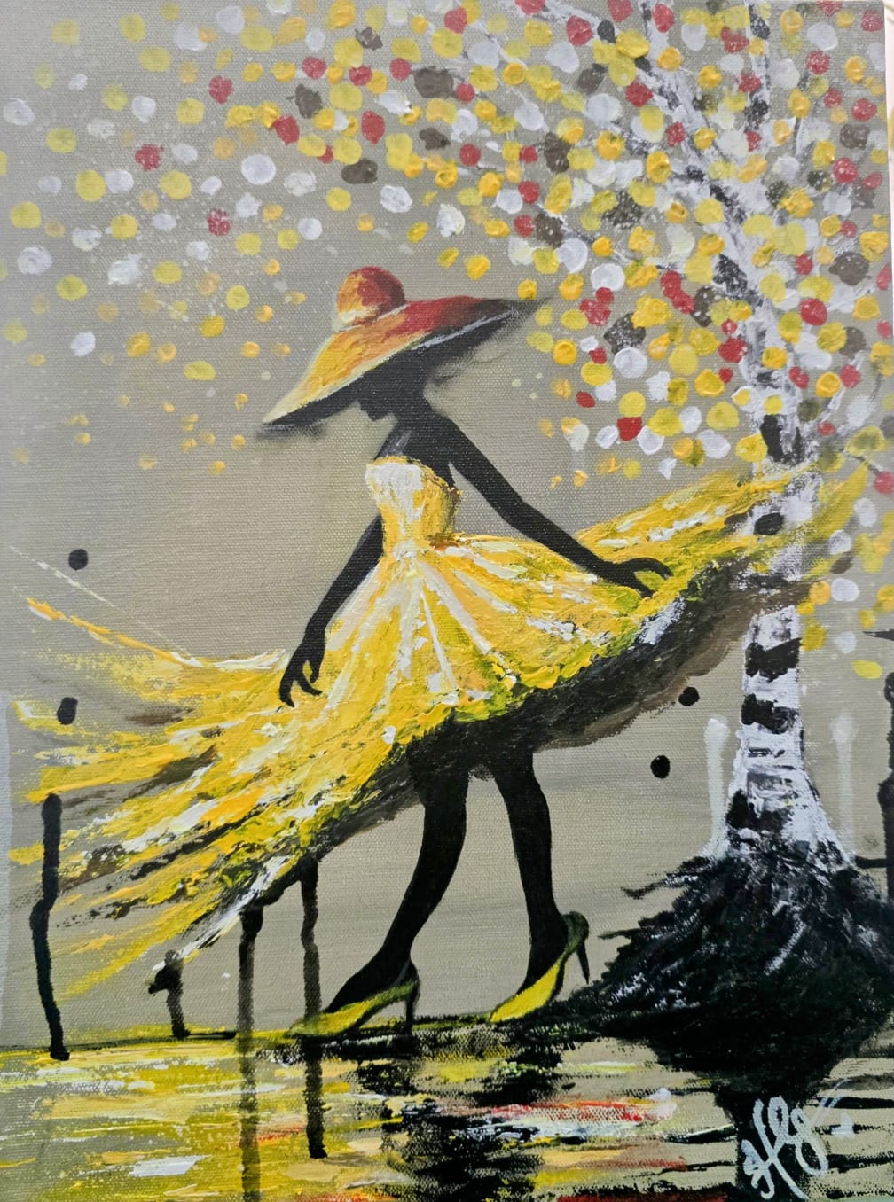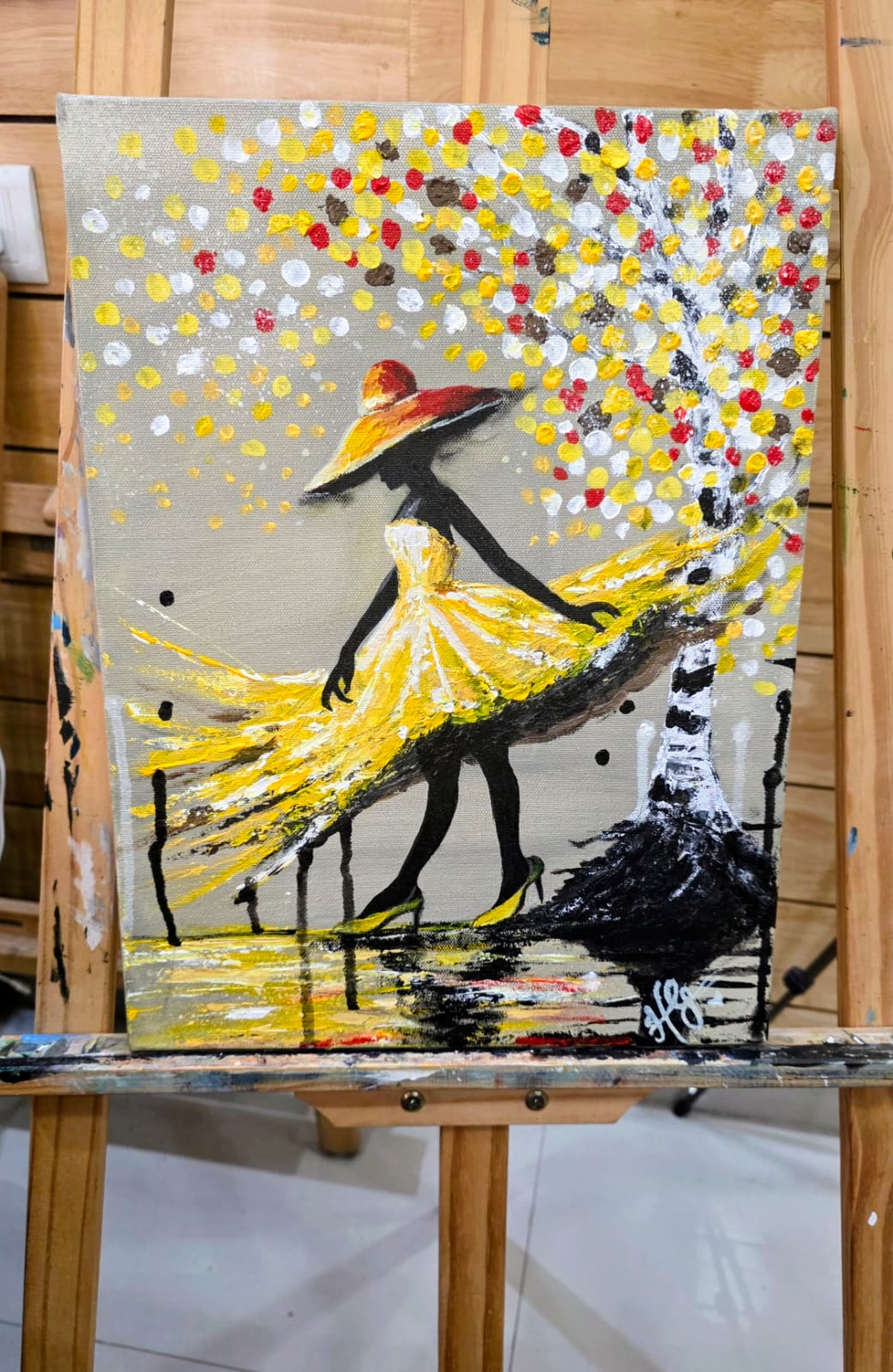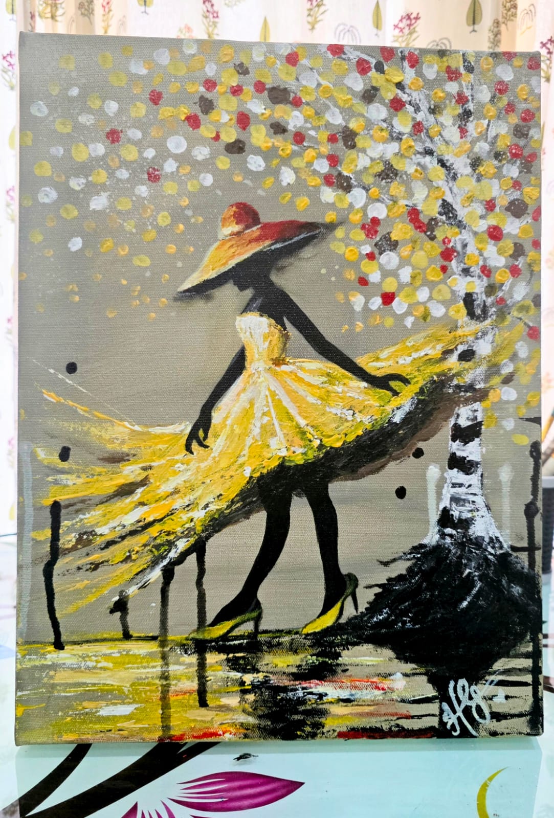 Created on 19th June 2024, This is a reflection of the absolute bliss of dancing, in own happiness, in a beautiful way. Painted on 14" X 18" inches white gesso primed canvas. Medium gloss varnish protected.