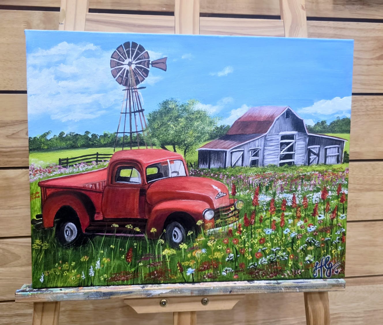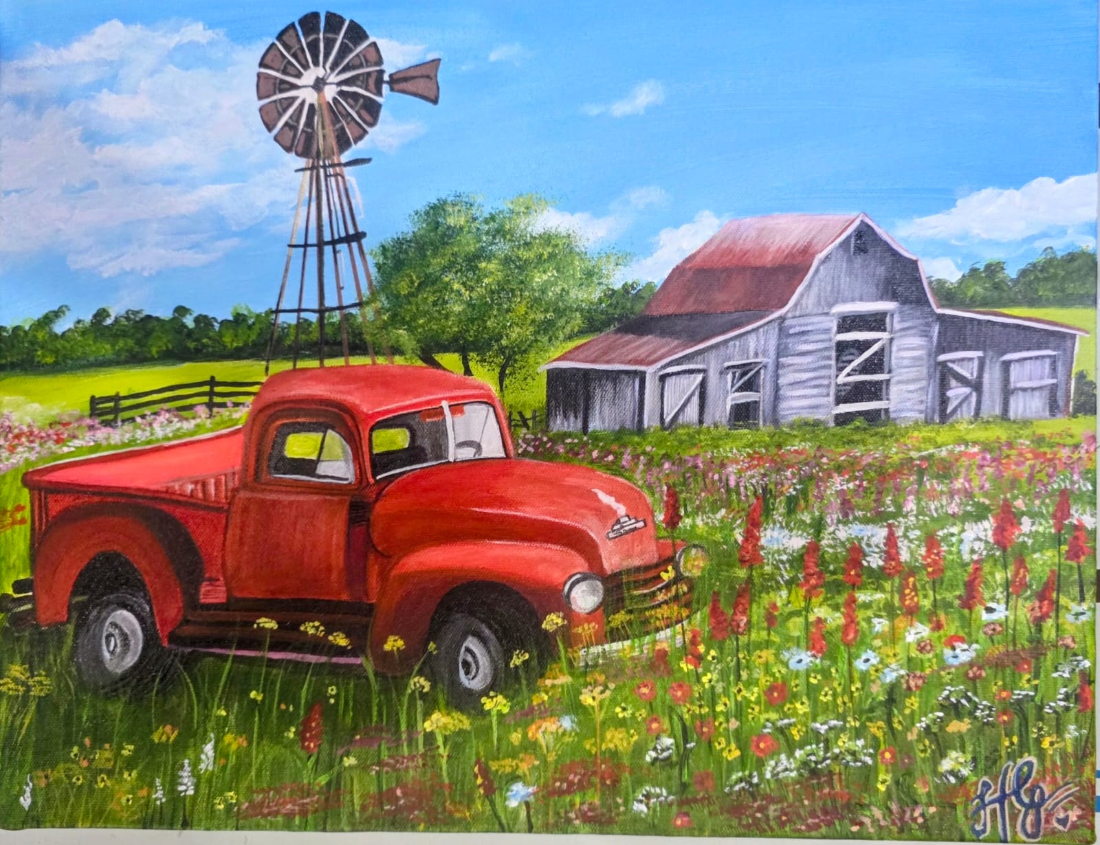 “A vibrant painting of a vintage red truck parked in a colorful wildflower meadow, with a rustic gray barn and a classic windmill in the background under a bright blue sky.” This painting captures a sense of sunny, rural nostalgia. Painted on 14×18 inches, pre-primed canvas, No Prints available.