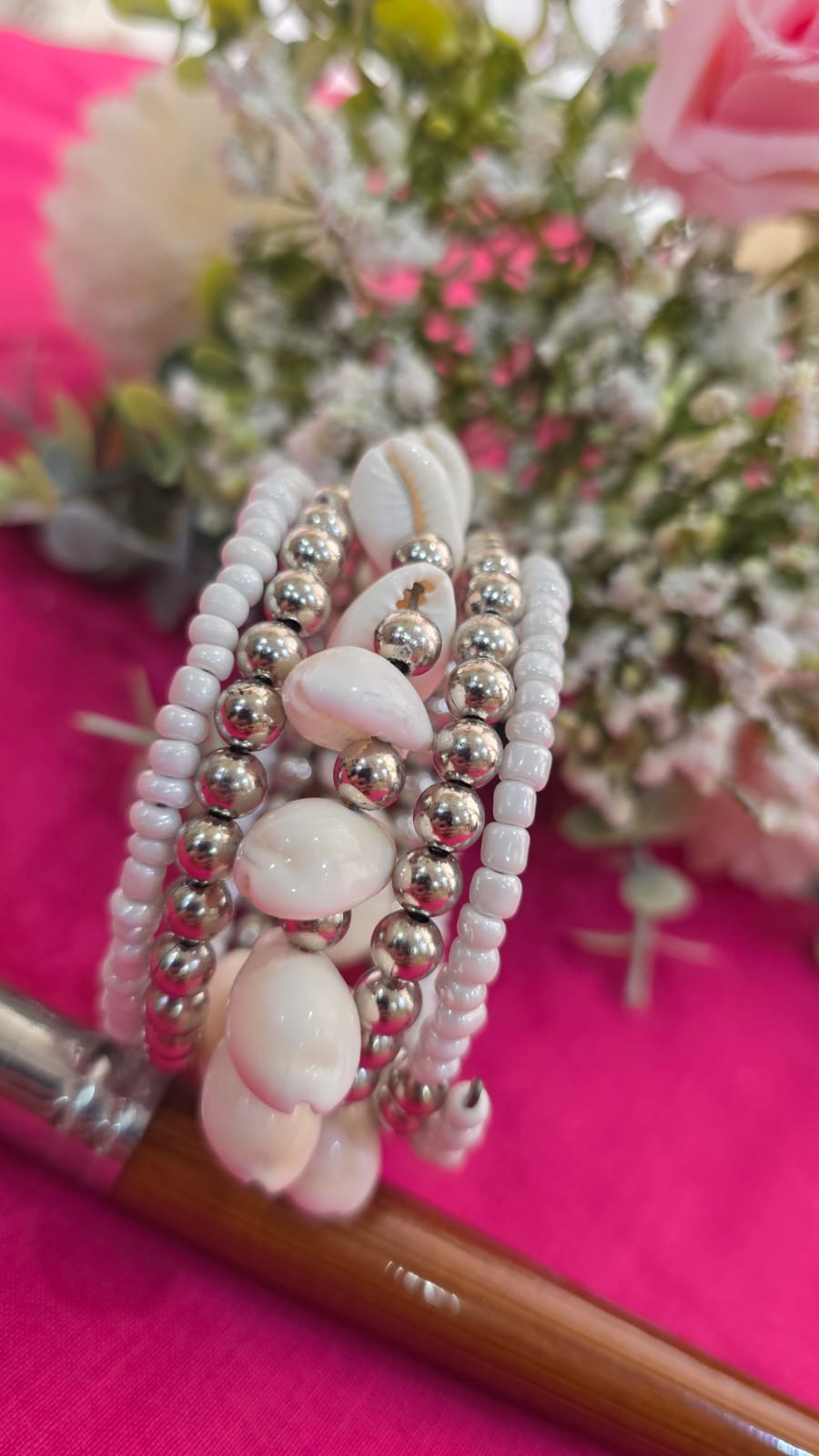 Material:– silver beads, stretchable spring, Beads, Seashells