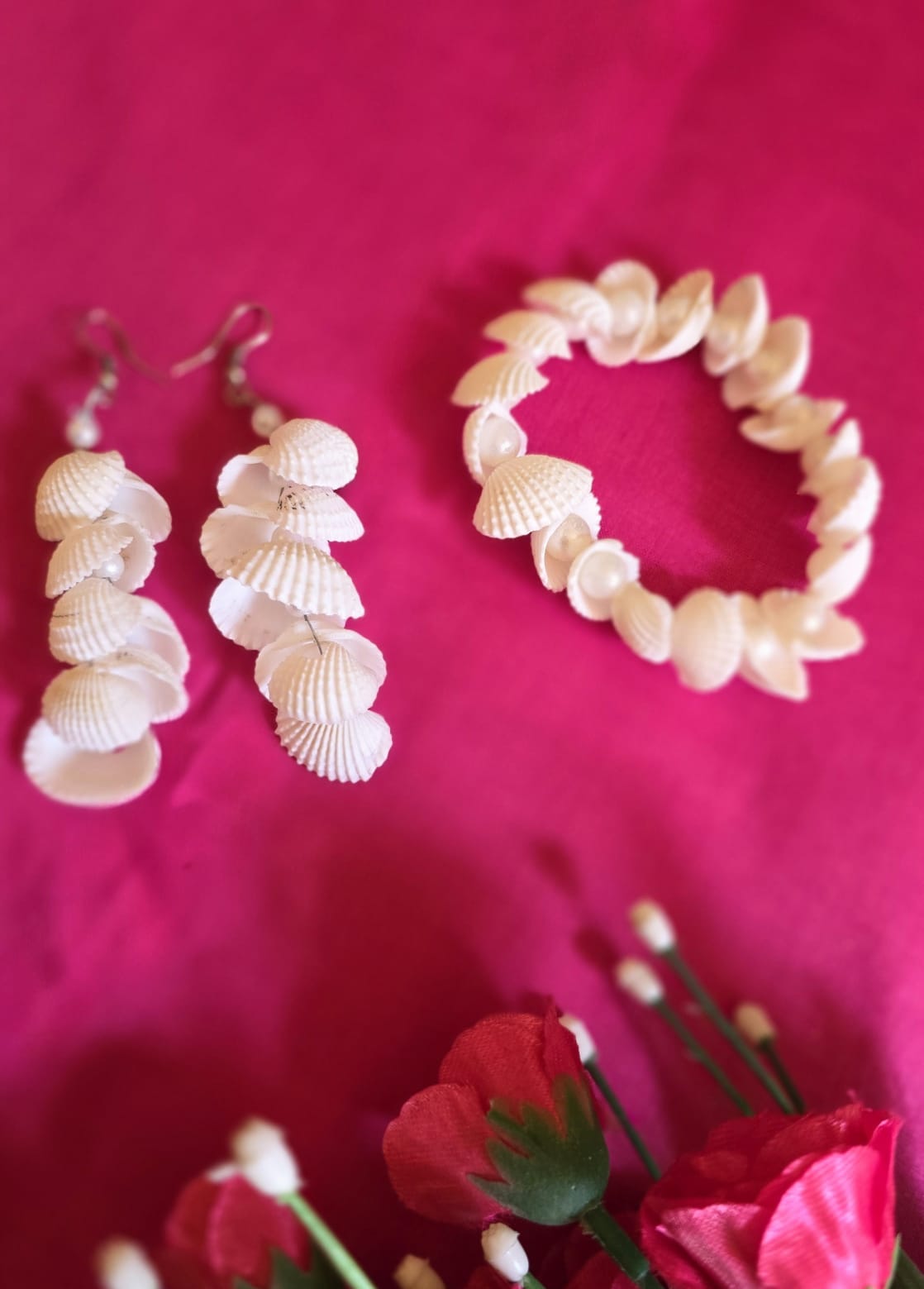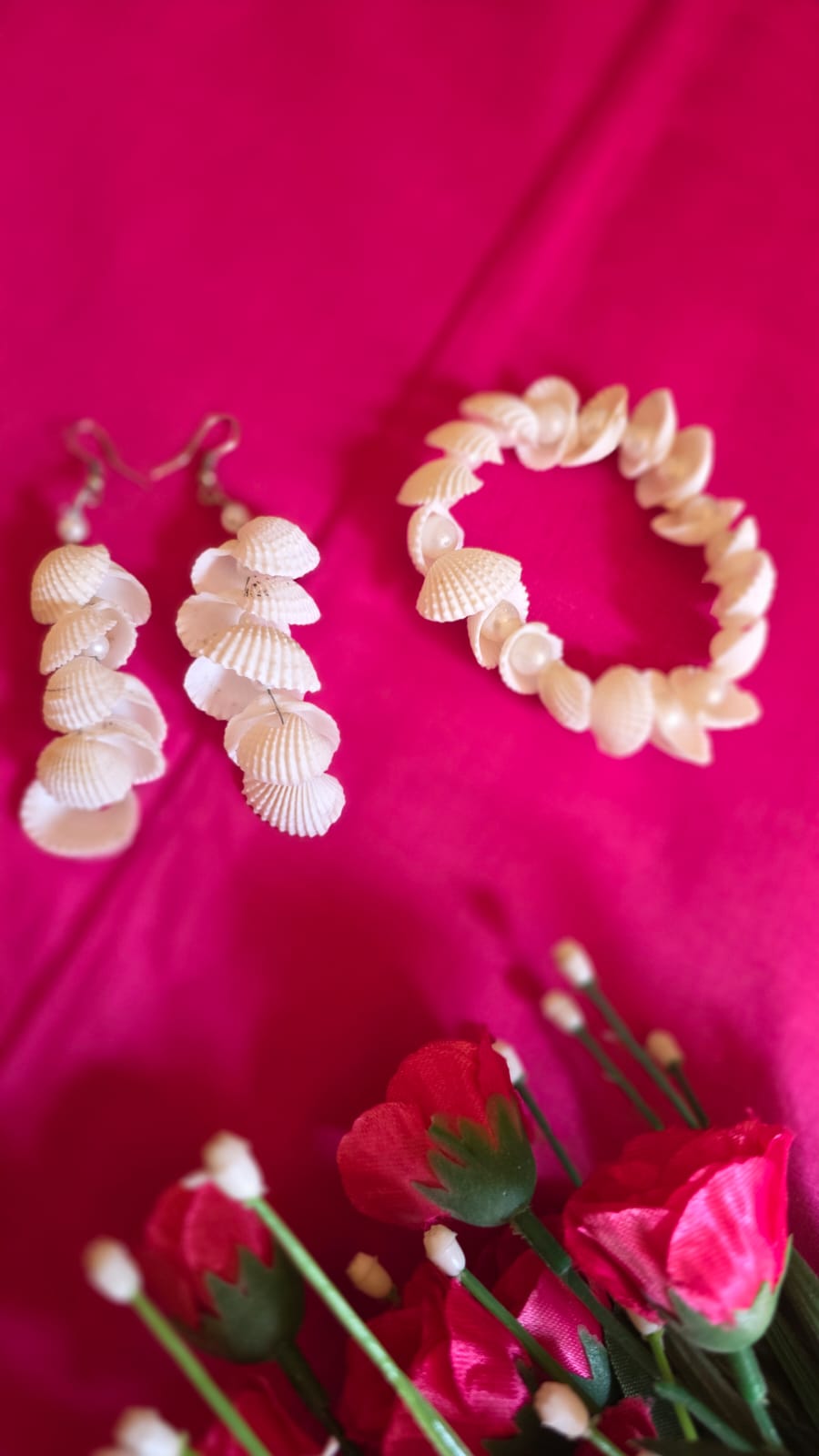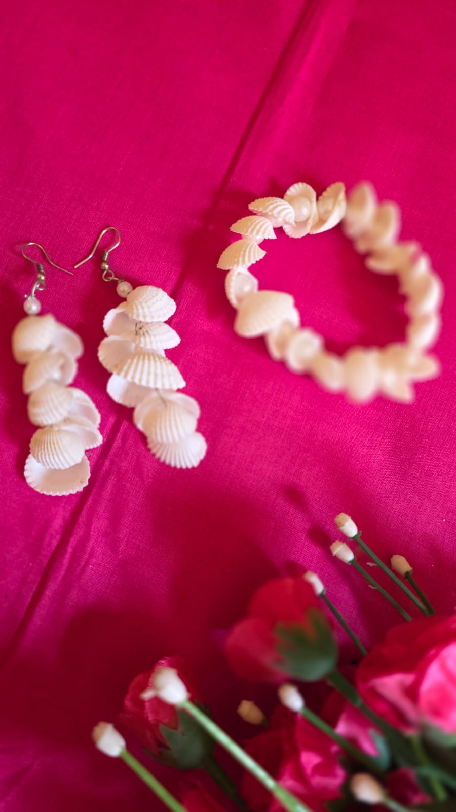 All of these natural shells and pearls are designed and matched with neutral schemes to make bracelets and earrings out of them. Handmade Seashell Bracelet & Earring Combo.