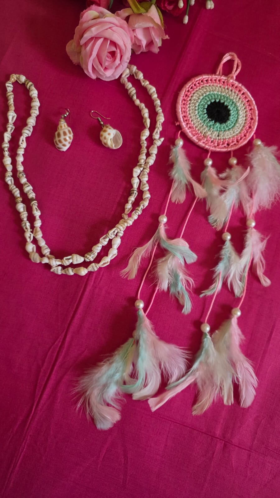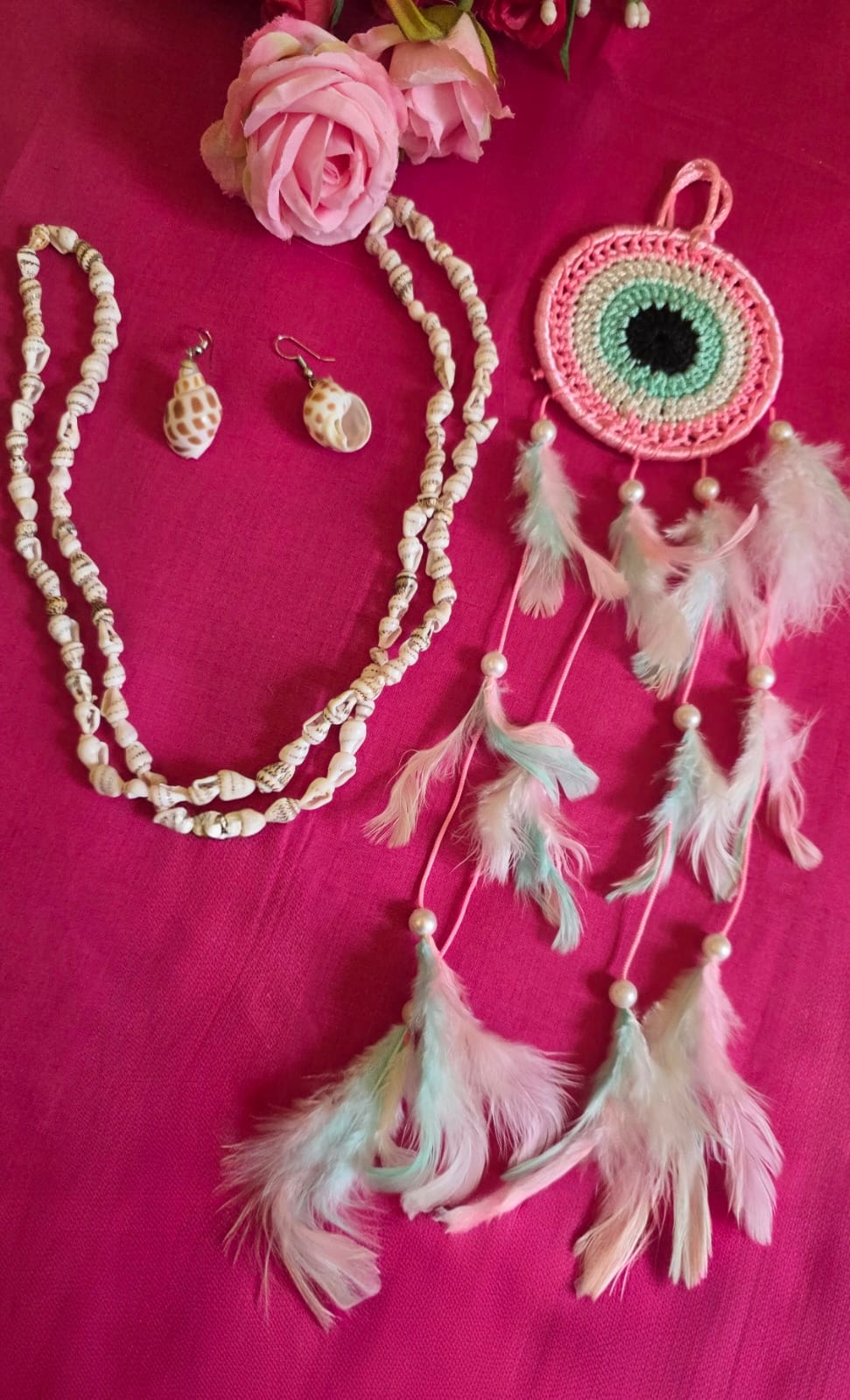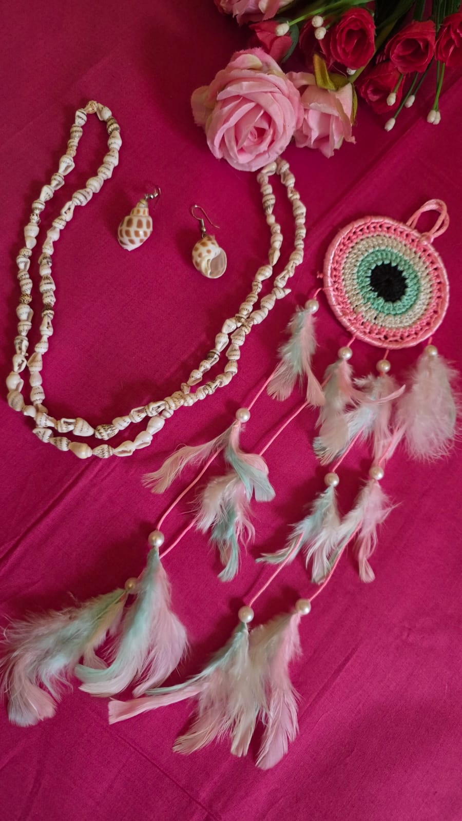 Home Hand crafted hand crafted jewellery Sea-shell Necklace – Earrings set combo with Dreamcatcher ( Pink)