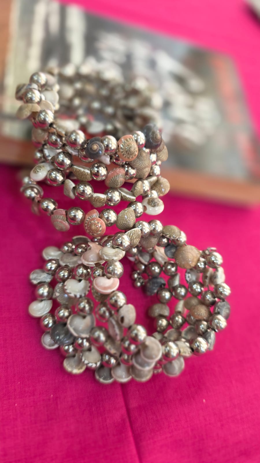 All of these silver bead shells and seashells are designed and matched with neutral color schemes to create bracelets from them. These are brown-tinted neutral bracelets with metal springs, best for any occasion to go with. Complete handmade natural beads and  Seashell bracelets.