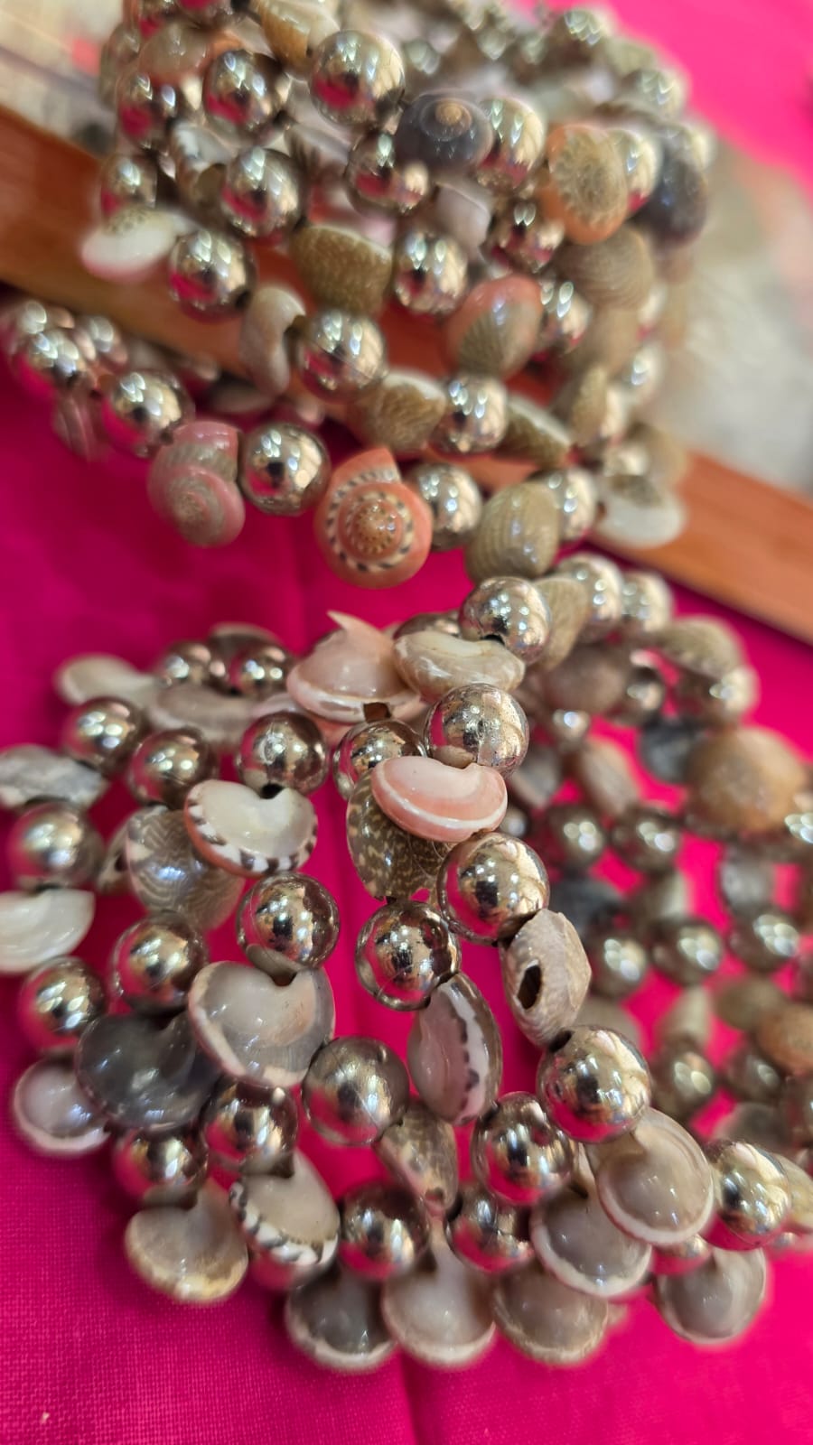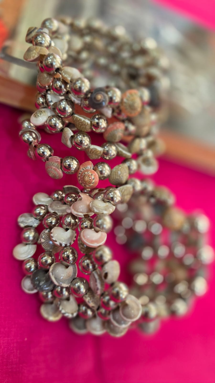 Material:– silver beads, stretchable spring, Beads, Seashells