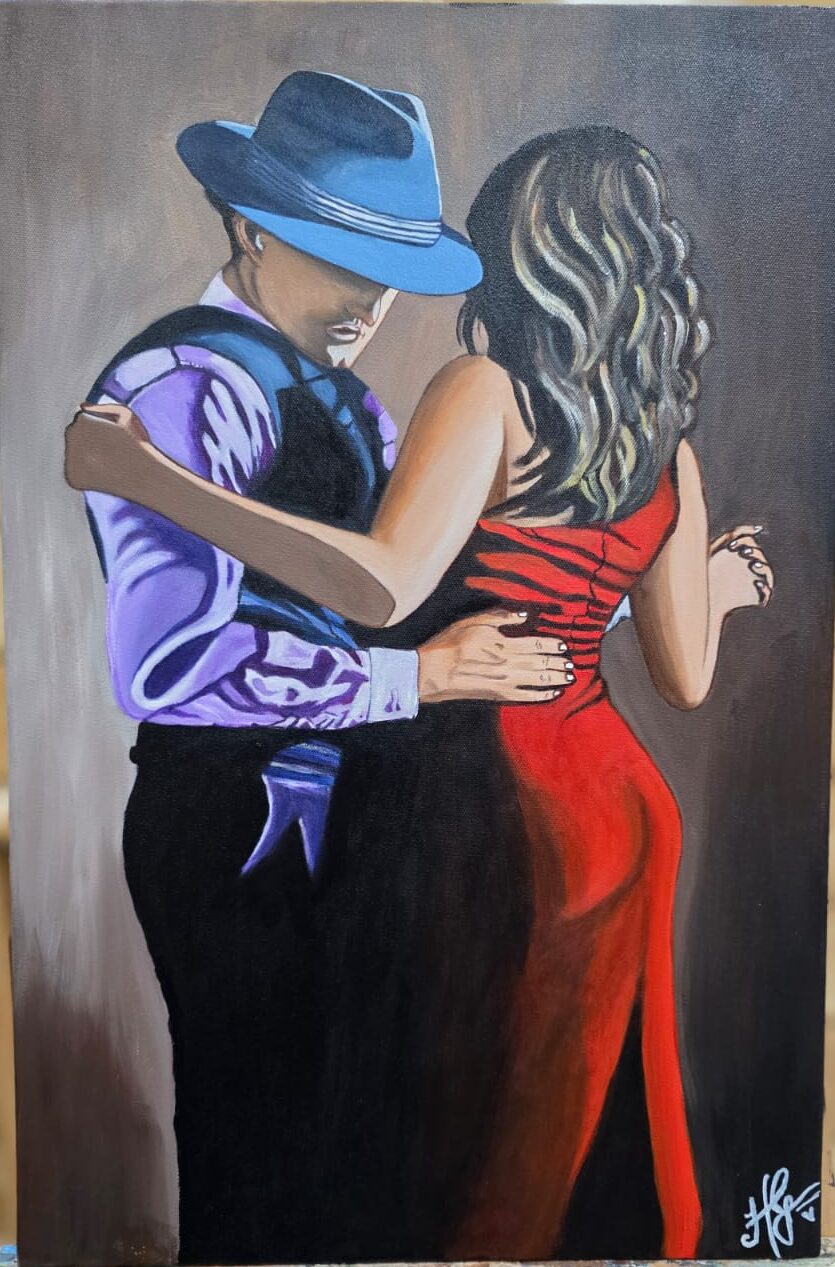 This evocative acrylic-on-canvas piece depicts a couple locked in a passionate embrace, likely mid-salsa—a bold, contrasting palette to define the figures. The man is draped in cool tones of deep indigo and violet, his face partially obscured by a classic fedora, which evokes a sense of mystery. In contrast, the woman is the focal point of warmth, wearing a vibrant, form-fitting red dress that symbolizes passion and movement. Painted on a pre-primed 16x20-inch canvas, No Prints Available.