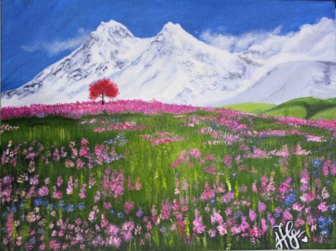 The Mountain is covered with snow, the bright blue sky, and the valley is covered with pink flowers. It’s springtime .. Painted on canvas 12″x 16″. White Gesso Primed, No Prints available.