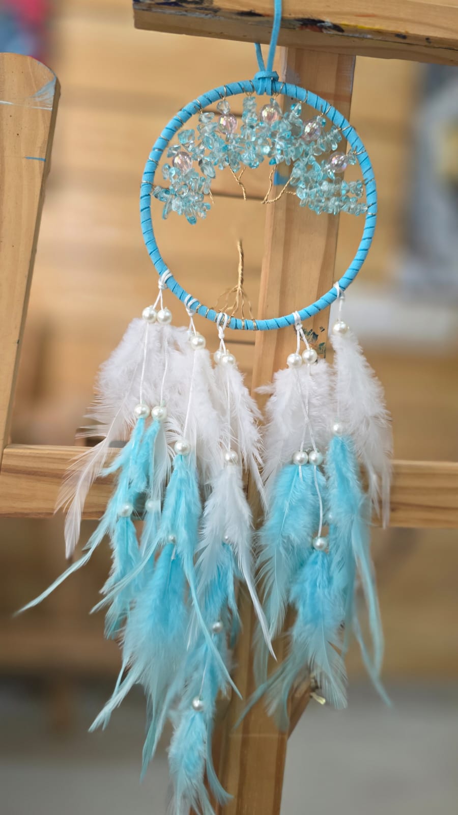 The Beautiful Dream Catcher makes an ideal gift for friends and family who appreciate meaningful decor with protective qualities. It’s perfect for housewarmings, birthdays, or occasions where a thoughtful, protective charm is appreciated.   Color:– White & Blue Material:– Feather, Metal, ABS Plastic Granules, stones Style:–  Modern Quantity:-  4 in Stocks Including Components:- Cord, and String Shape:- Round Mounting type:–  Hanging  The price mentioned above is for each piece.