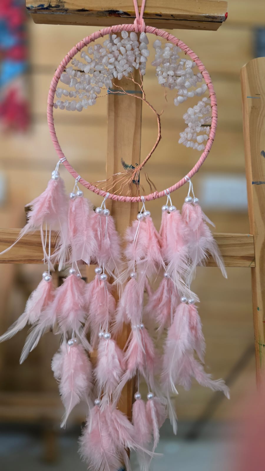 Tree of Life Dreamcatcher | Crystals | White & Light Pink | 6 inch
