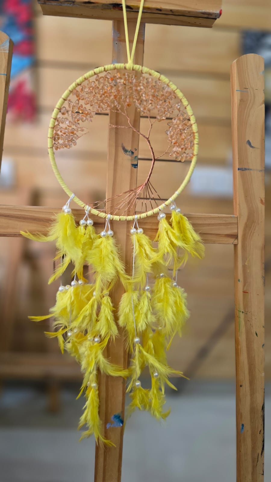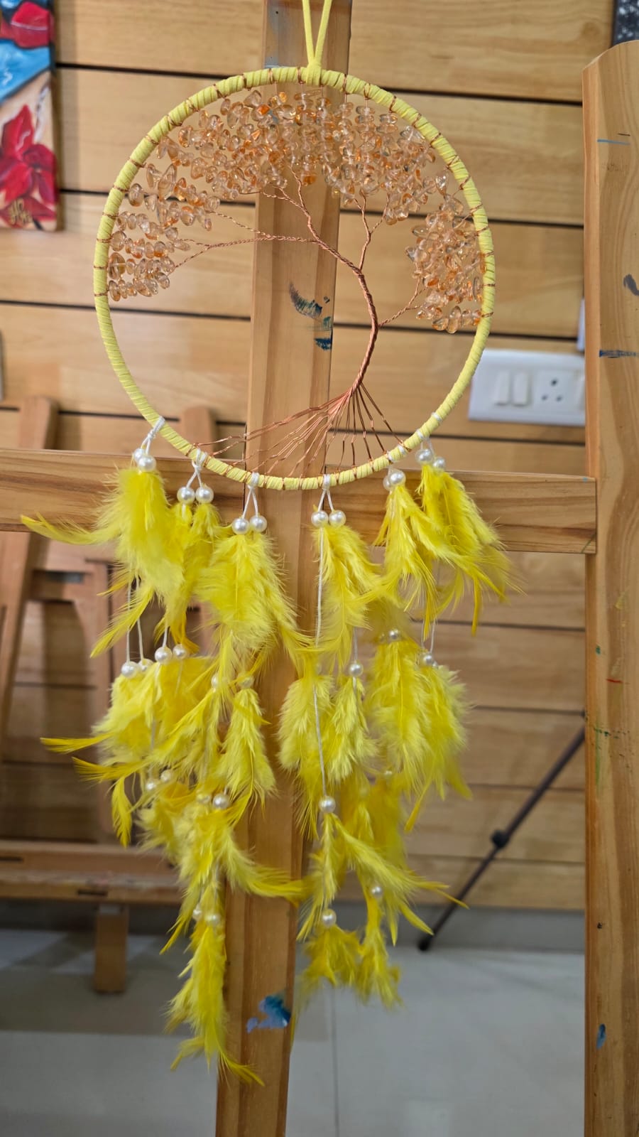 Bring a bohemian flair to your surroundings with this beautiful dream catcher. Its intricate design and flowing feathers create a serene and artistic ambiance, ideal for enhancing any room’s decor.