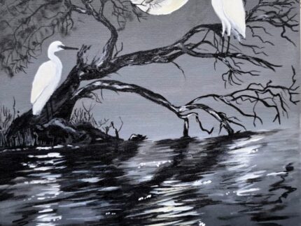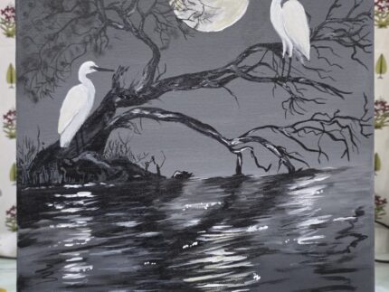 This is a striking monochromatic acrylic painting that captures a serene, nocturnal scene. The artwork features two elegant white Cranes perched on the dark, winding branches of a tree overhanging a body of water. Painted on a 12x16-inch pre-primed canvas, secured with medium gloss varnish.